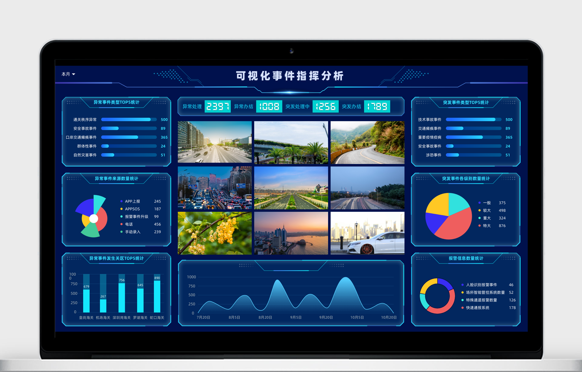 整體態(tài)勢展示應(yīng)急指揮中心針對事件各方面進行統(tǒng)計分析,并可按本日、本月、本年、近30天、近3月、近半年、近一年進行統(tǒng)計。支持圖表、數(shù)據(jù)列表等多種形式組合展示。